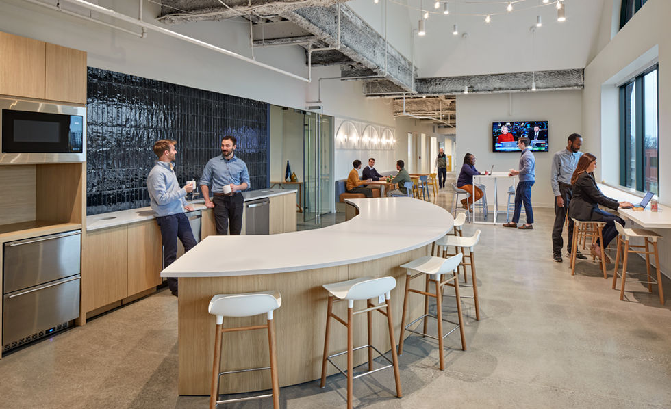 Mirador wanted a space that matched their culture: everyone in the office collaborating and innovating, working hard and playing hard. With a relatively young staff, it was important to make them want to come into the office rather than force them. To that end we created a wide array of different types of meeting spaces, lounge areas, private rooms, open collaboration areas, game areas, phone booths, a boardroom, and benching desks. At the center of it all are two double-height, well-appointed spaces where people can congregate, relax, blow off some steam, or just have the occasional chance meeting. One is a pantry with polished concrete floors, decorative lighting, banquette seating and a beautiful blue tile wall. The other a “Beverage Bar” with a coffee station, beer taps, a soda fountain, and refrigerators to hold any assortment beverages. The floors are wood to warm up the space, and the seating is either at the bar or in a more relaxed lounge setting. The client was so happy with the space that we have designed a second floor for them.